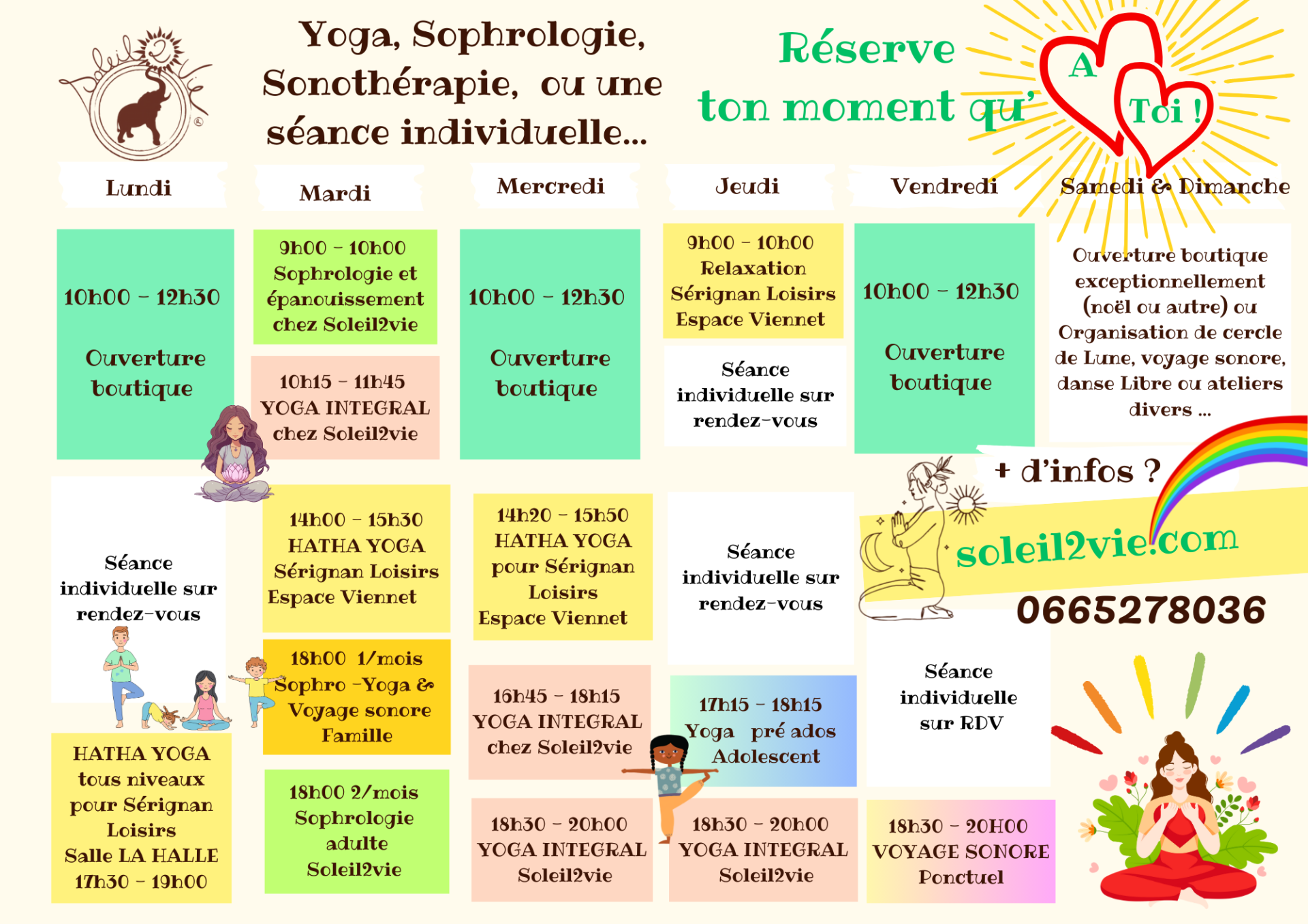 Je m'aperçois que dans la précédente lettre je ne vous ai pas confirmé qu'il y aurait cours le 30 décembre : sophro à 9h00 et yoga à 10h15 !